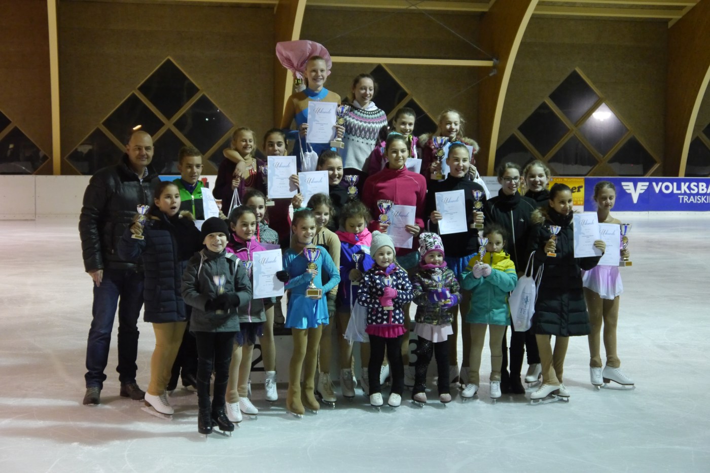 Am 6.3.18 fand auf der Kunsteisbahn in Traiskirchen, der „Heimat“ des TER die Vereinsmeisterschaft 2018 statt. Rund 100 Besucher waren gekommen um die Kunstläuferinnen und Läufer bei ihren Programmen zu bewundern. Den Beginn machte die jüngste Gruppe, die „Minis 1“ die gemeinsam mit der Trainerin ihr Erlerntes dem Publikum zeigten. Als nächstes zeigte die Gruppe „Mini 2“ ihr Können. Sie boten erstmalig ihre Kürprogramme einem Publikum und auch den anwesenden Preisrichtern dar. Danach kamen die Kunstläufer mit ihren Programmen. Nach Auswertung der Preisrichter erfolgte die Siegerehrung „On Ice“. Jedes Jahr wieder ein Highlight der Saison. Jeder Teilnehmer wurde mit einem Pokal und einer Urkunde geehrt. Abgerundet wurde der Abend mit einem gemeinsamen Buffet, welches von den Eltern der Läuferinnen und Läufer bereitgestellt wurde. An diesem Abend gab es nur lachende Gesichter und es herrschte den ganzen Abend eine gute Stimmung. Die Harmonie zwischen den Läuferinnen, die schon das ganze Jahr vorhanden war, war für jedermann zu spüren. Jeder gratulierte jedem zu seinen Erfolgen.